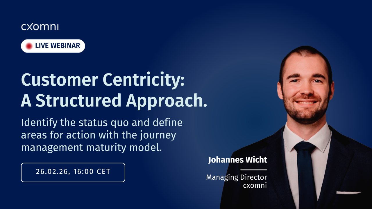 - Customer Centricity: A Structured ApproachCustomer Centricity: A Structured Approach Identify the status quo and define areas for action with the journey management maturity model. Date: 26th of February 2026 Time: 16:00 CET (Berlin) Duration: 1 Stunde...